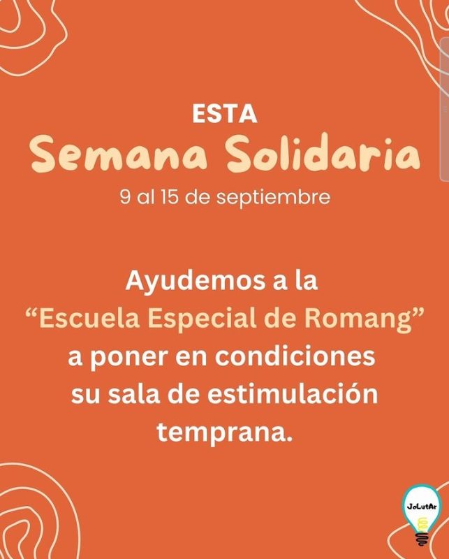 Convocatoria de JOLUTAR a la Semana Solidaria del 09 al 15 de Septiembre, ayudando a la Escuela Especial de Romang, Santa Fe. Nuestro acompañamiento de fe a niños y adolescentes que nos están necesitando y nuestro sostén a la comunidad que se brinda a ellos con total dedicación. Nuestro aporte, por más pequeño que sea, será de bendición.